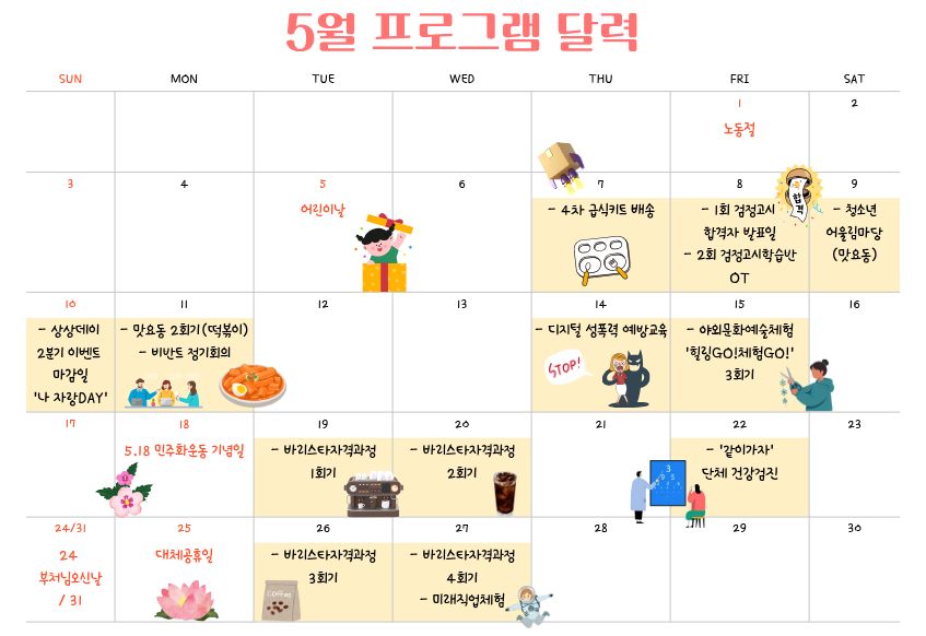 [ºÏ±¸²Þµå¸² 5¿ù ÇÁ·Î±×·¥ ¾È³»]2026³â 5¿ù ÇÑ´Þ ÇÁ·Î±×·¥ ´Þ·ÂÀÔ´Ï´Ù~!ÇнÀ¹Ý ½Ã°£Ç¥´Â OT ÀÌÈÄ È®ÀÎÇØÁÖ¼¼¿ä~!* 5¿ù ÈÞ¹«ÀÏ ¾È³»5¿ù 1ÀÏ ±Ý¿äÀÏ : ³ëµ¿Àý5¿ù 5ÀÏ È¿äÀÏ : ¾î¸°À̳¯5¿ù 18ÀÏ ¿ù¿äÀÏ : 5.18 Áö¹æ°øÈÞÀÏ5¿ù 25ÀÏ ¿ù¿äÀÏ : ´ëüÈÞÀÏ